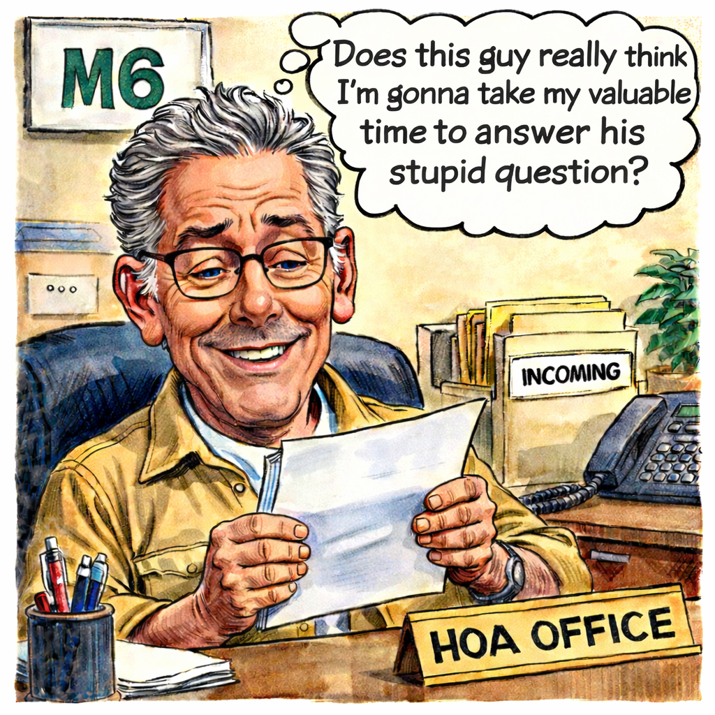 In fact, Mr. Morgan told me in a reply email sent back to me on December 21st that if I wanted answers like that he’d have to pass my question on to the Association’s lawyers and he’d expect me to pay the legal costs for obtaining those answers. Well, that certainly made no sense it me. I mean, if he sent out the letters, shouldn’t he already know what he meant concerning what the letters contained? (I guess that assumes he was actually responsible for those letters, why I now highly doubt.)